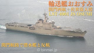 潜水艦と反航 海上自衛隊輸送艦おおすみ 関門西航+佐世保入港 LST-4001 JS OSUMI - JMSDF Osumi-class tank landing ship - 2023 [4K]